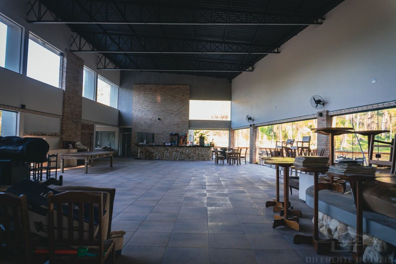 Salão Principal com 3 banheiros sendo um masculino com mictório e 2 cabines, 1 feminino com 3 cabines e um banheiro para deficientes, o salão conta com palco, deck de madeira com vista para o lago, todo o salão com portas e janelas de vidros, com uma varanda com guarda corpo em vidro.